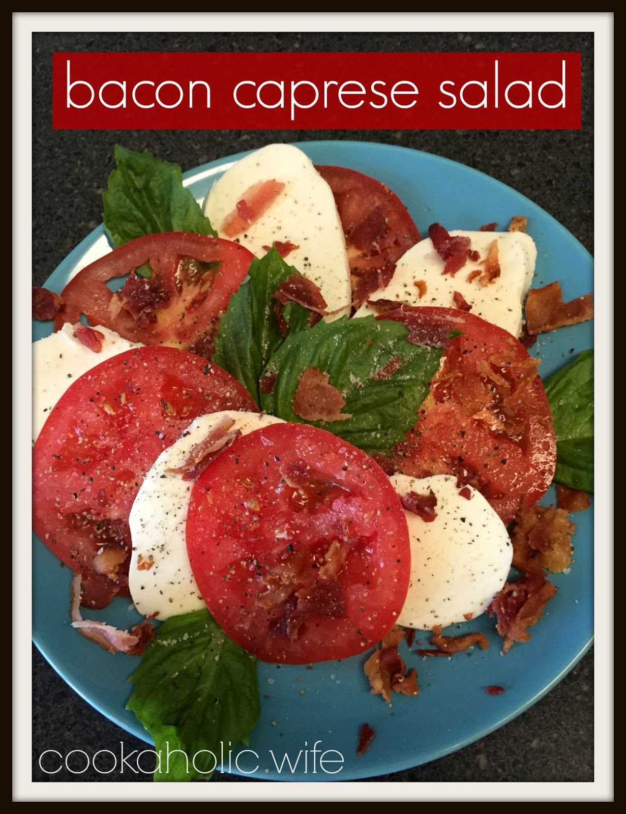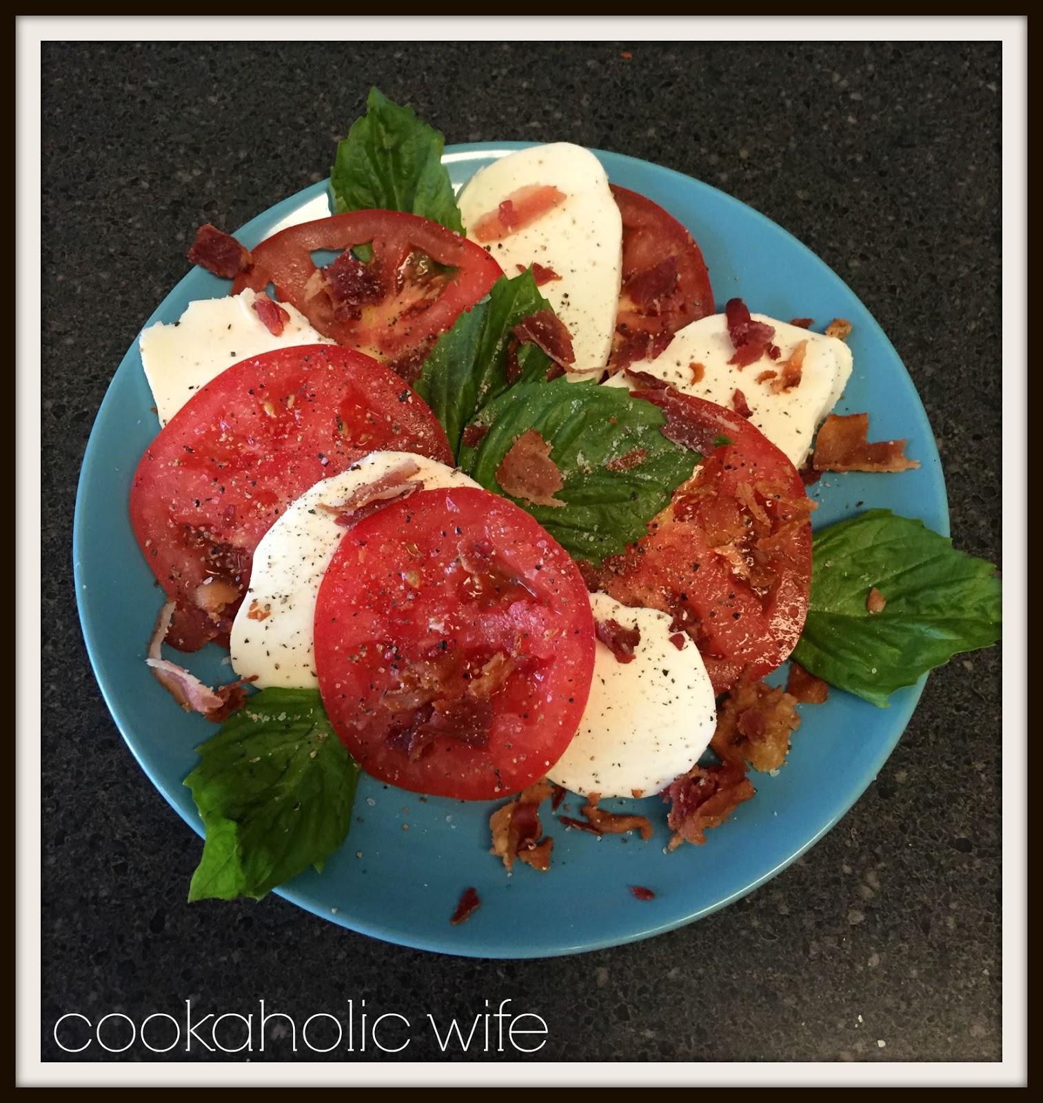 Sarah made this recipe with a warm bacon dressing which I intended to make, until I thought about the fact that I planned on having this for lunch at work. I knew I couldn't pour the dressing over the tomatoes and mozzarella in the morning or it would get soggy and weird by lunchtime. I opted to just skip the dressing portion (except for what I ate at home that day) and put the crumbled bacon on top. Not a bad choice for a portable meal!
