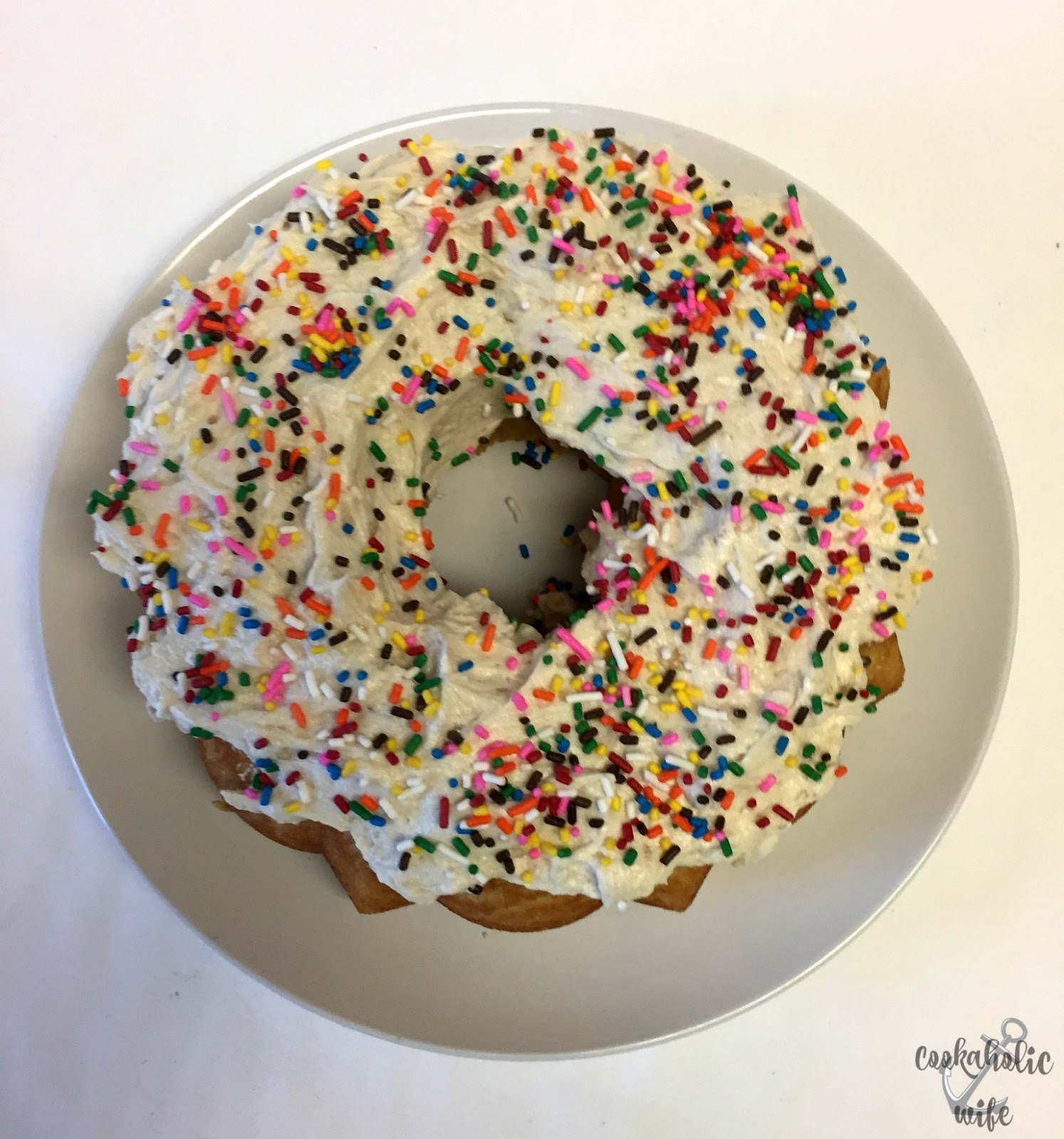 When I think of sugar cookies, I think of a moist, crumbly cookie flavored with butter, a hint of a vanilla and almond. I opted for that as a my cake base and then when I realized I was out of powdered sugar, I had to improvise on another recipe that uses flour, milk, butter and granulated sugar instead. And no birthday bundt can be complete without some sprinkles!