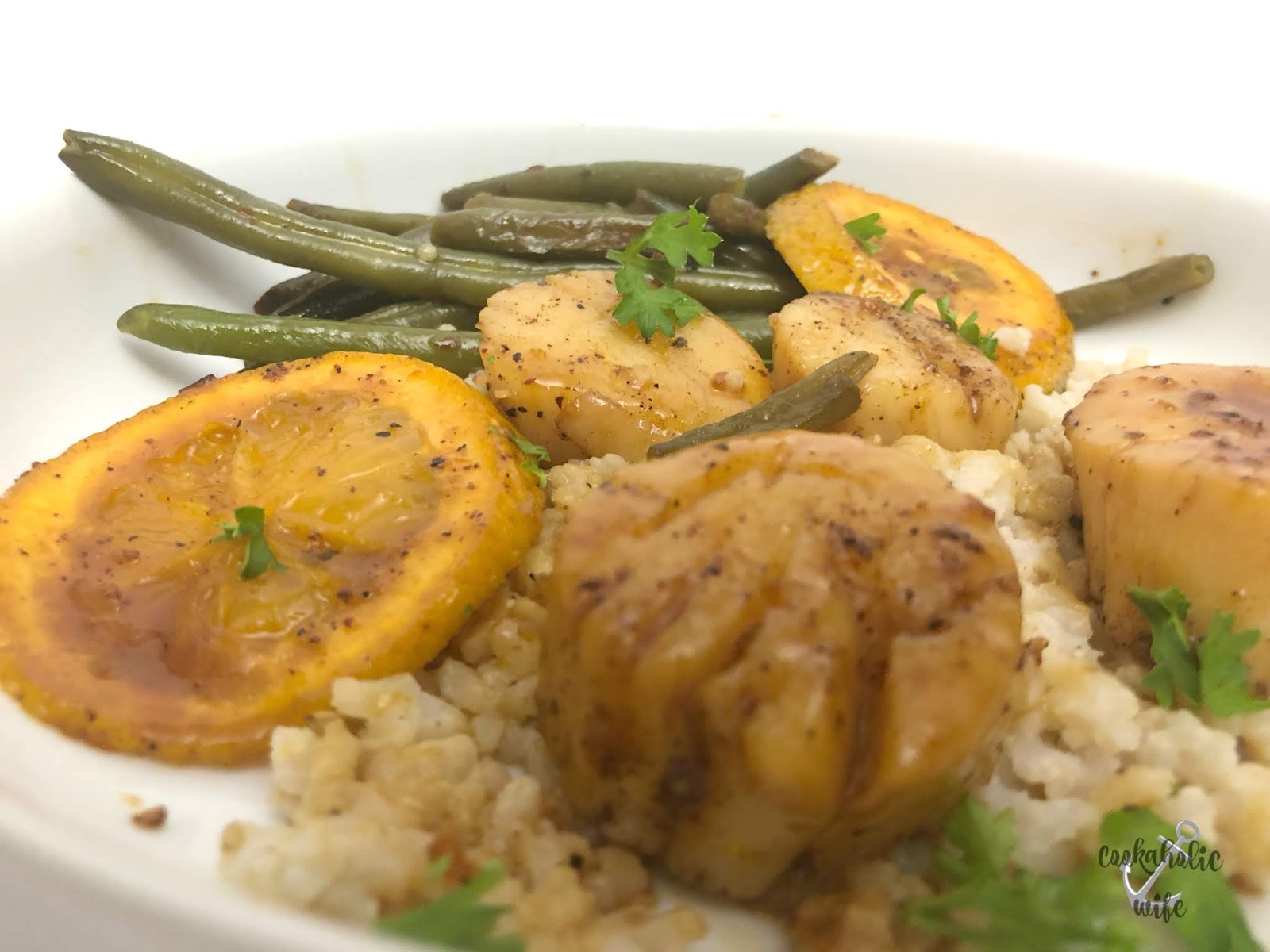 I served this dish with brown rice and spicy green beans. The scallops were perfectly tender and the dish had the perfect amount of sweetness from the orange juice and heat from the crushed red peppers. Tom said it's one of his favorite dishes that I've ever made, which was surprising because he doesn't usually like anything savory that involves citrus.