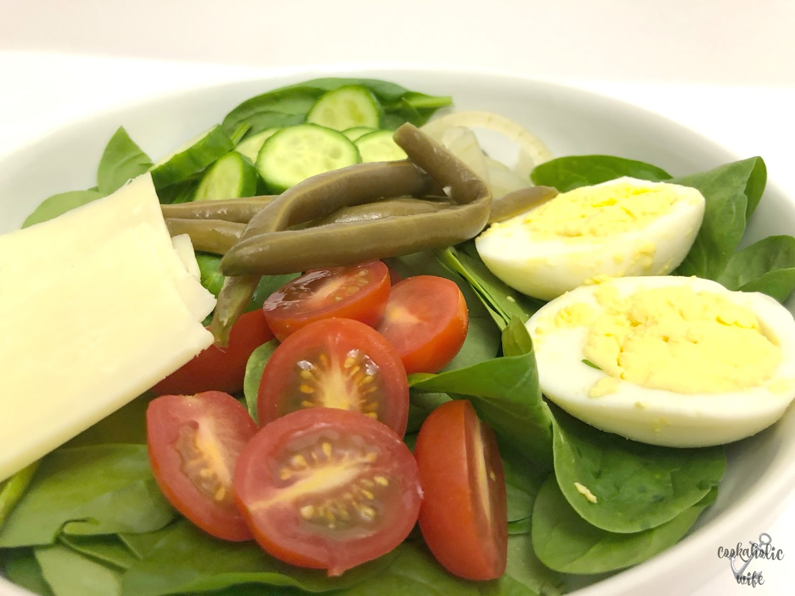 - Prepare the salad by adding the lettuce to a bowl. Top with the tomatoes, cucumber, hard boiled eggs, pickled green beans, and slices of Irish cheddar cheese. Drizzle salad dressing on top.