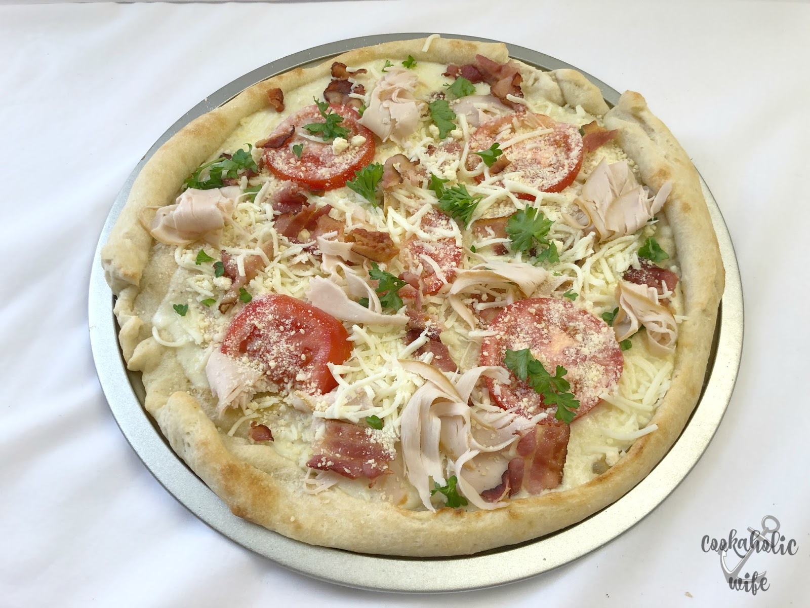 The idea of deli turkey on a pizza is a little weird, until you try this pizza. I could not get over how good it was. The cheese sauce provides a nice base, the bacon a little crunch and the tomatoes the perfect amount of sweetness. The only thing I would change is I'd probably double do it with pimientos and tomatoes, because I love both of them and I really think there should never be a wasted opportunity to use pimientos.