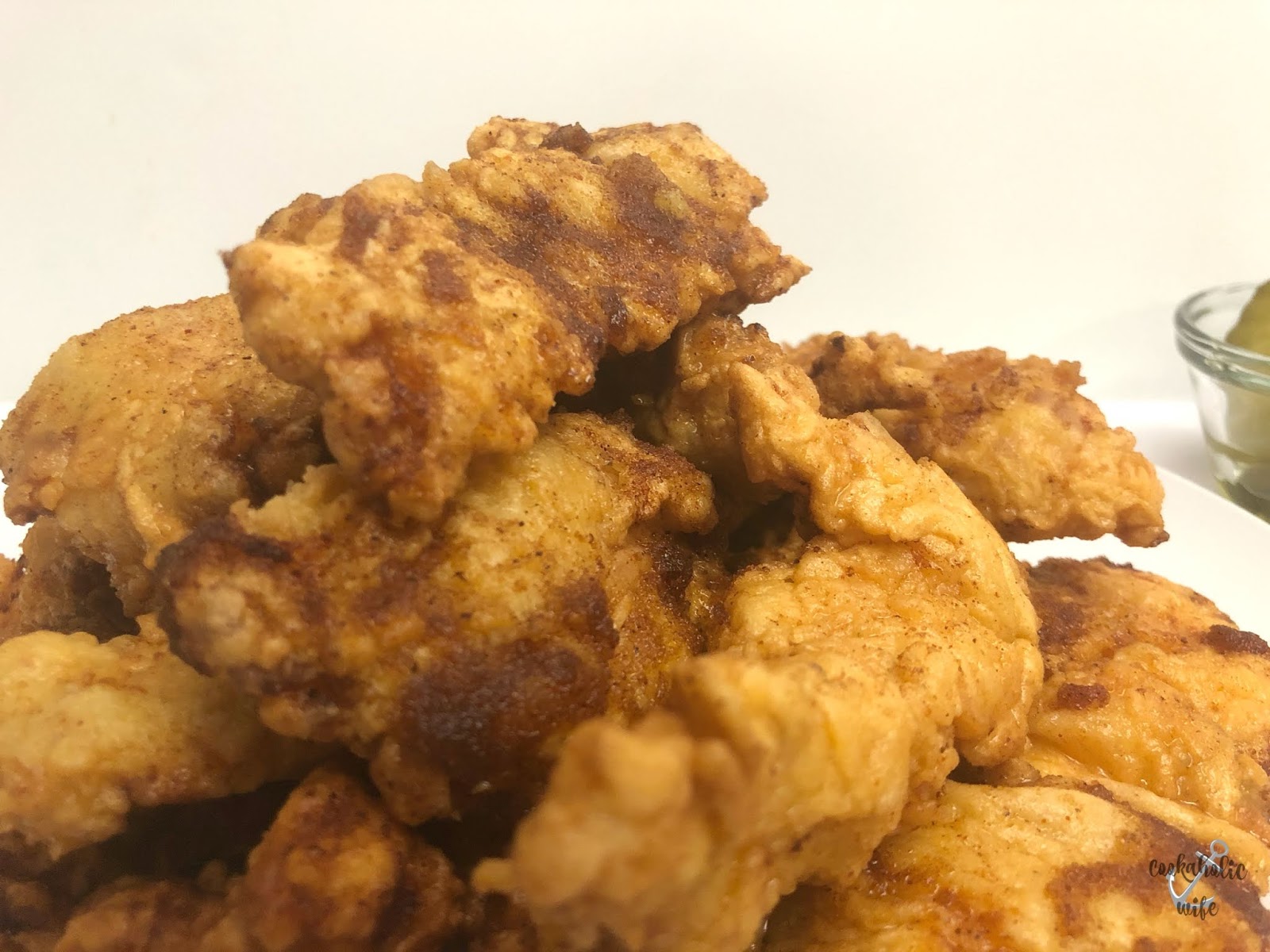 - 9. Carefully ladle 1 cup of the hot cooking oil into the spice mixture and whisk until it is combined. Place the fried chicken strips into the bowl and toss to coat, making sure they’re all covered with the sauce.