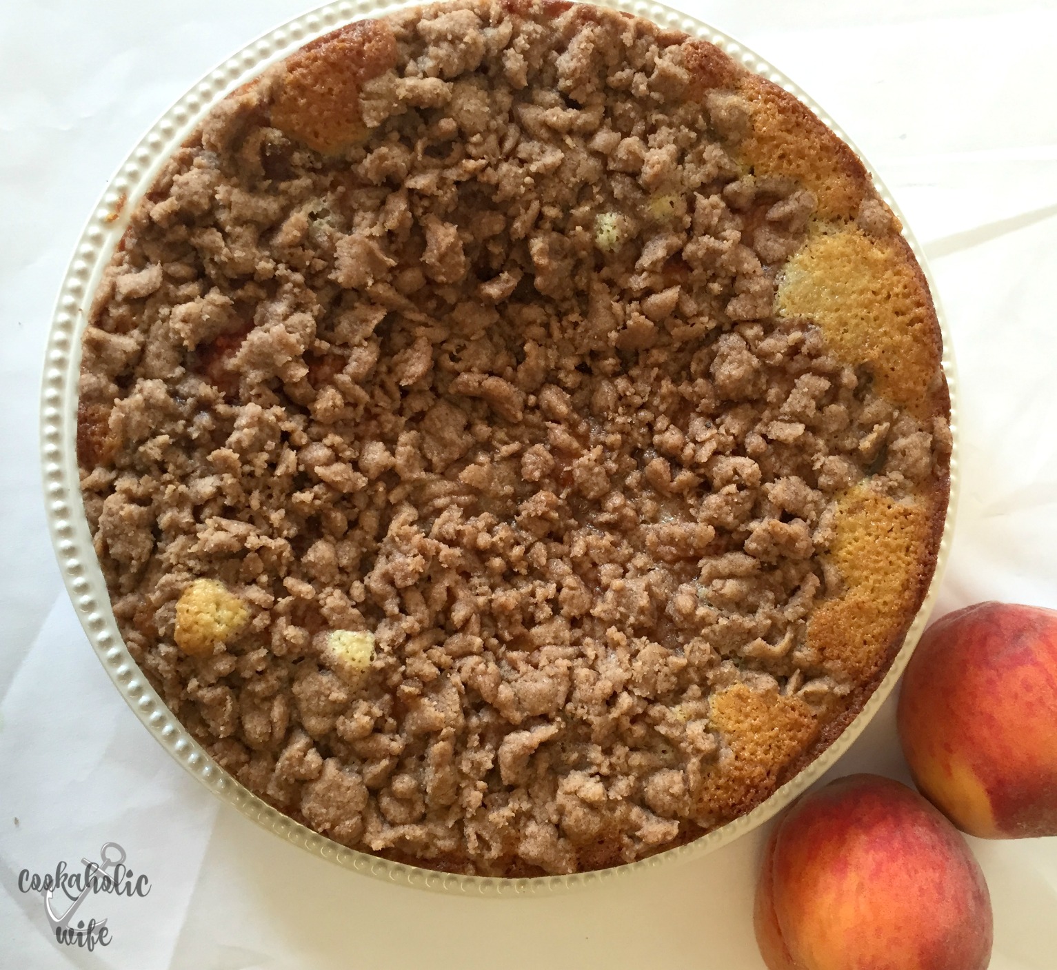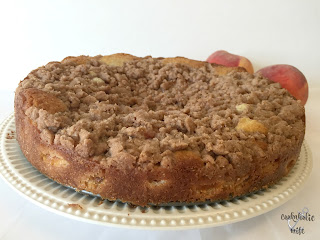 This cake is absolutely delicious! The batter is light and fluffy, the fresh peaches really shine through and the crumb topping manages to be light and dense at the same time, creating that perfect crumbly flavor.