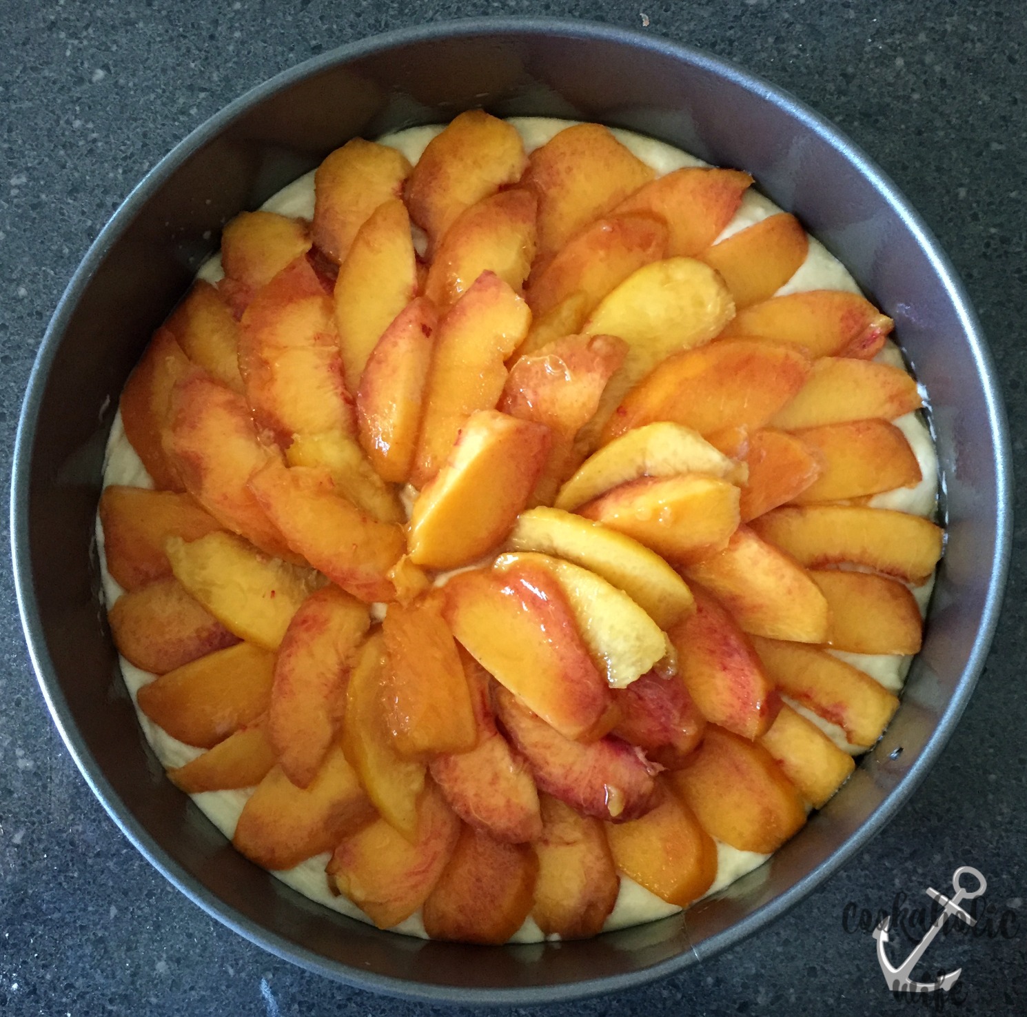 6. Arrange the peaches on top of the batter in a circle.