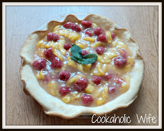Ironically this recipe wasn't one that I had saved forever but came to me while wandering through the produce section of the grocery store and finding a huge pile of ripe peaches on sale next to containers of raspberries, also on sale. I had an extra refrigerated pie crust hanging out in the fridge since I made Minny's Chocolate Pie and the idea of an peach raspberry pie came to me. I wanted to show off the fruit in its delicious ripe glory so I opted for an open-face or topless pie. Topless pie sounds a bit naughty, so we'll go with open faced, yes?