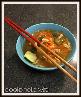 In order to make this more appealing to Tom I omitted the bean sprouts and added carrots. (Plus my local store doesn't carry them) I thought this was delicious. It's time consuming to make the stock, but you could easily just use prepared chicken or turkey broth if you don't have the initial hour and 40 minutes for roasting and simmering.