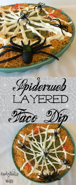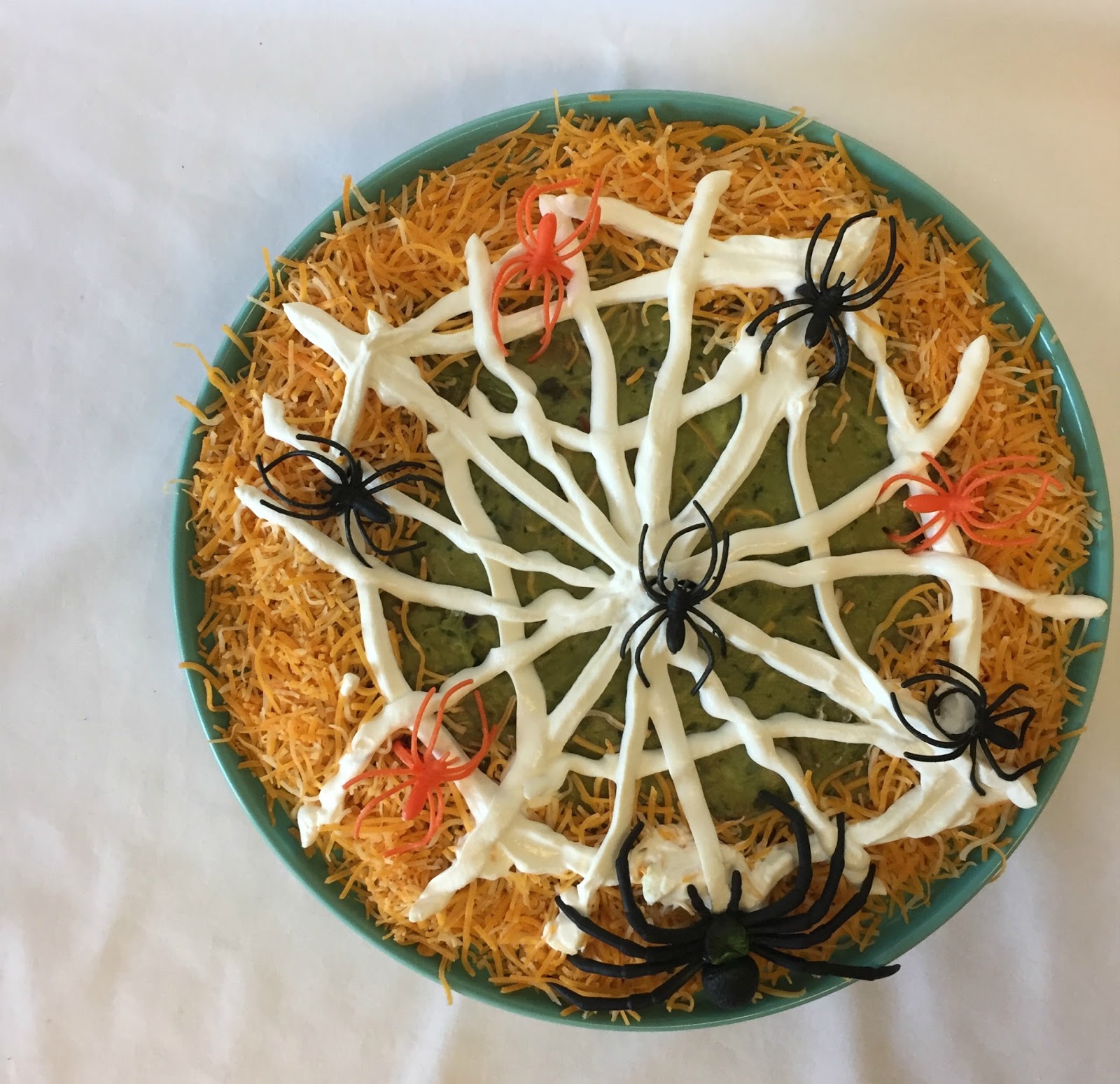 One of the recipes that I made for both parties was this spiderweb seven layer dip. It uses some pretty basic ingredients and is very easy to put together. You just layer each ingredient on top of each other and then draw a spider web in sour cream on top. I had found a package of plastic spiders and couldn't pass up throwing some of them on there as well!