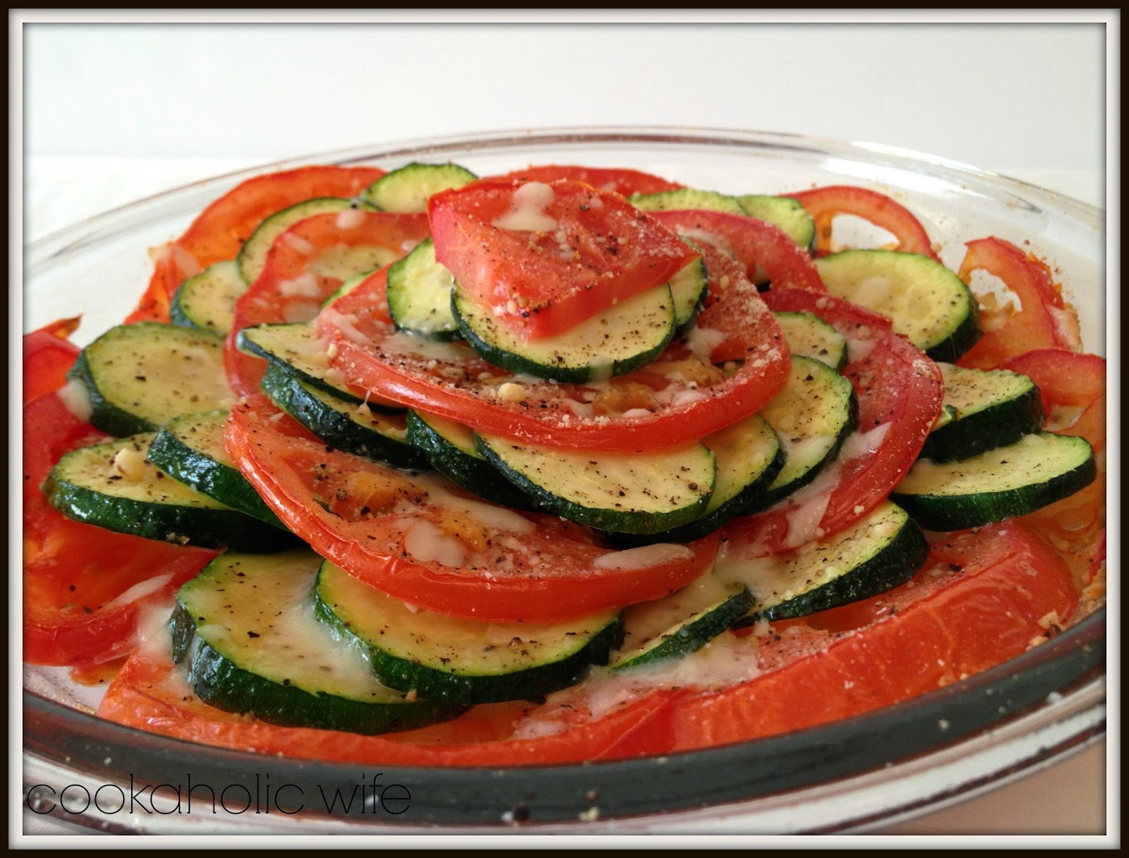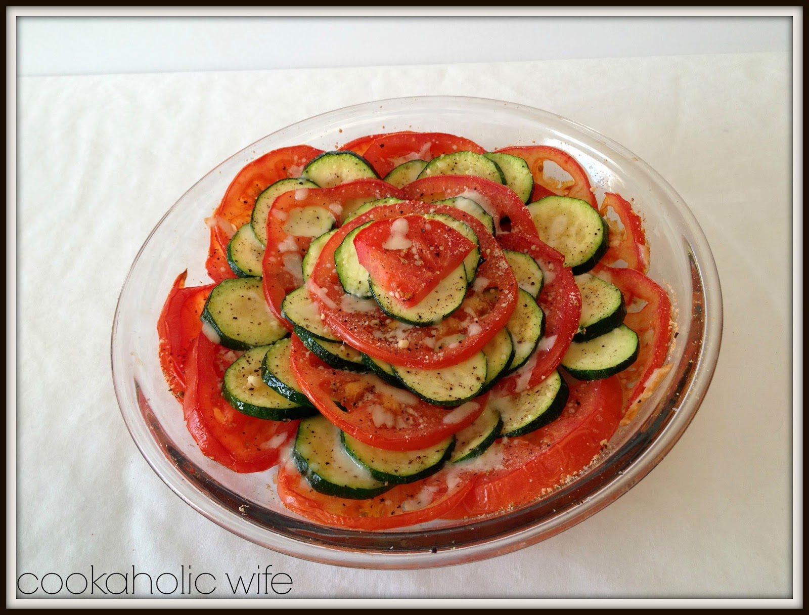 The only change I made to this recipe was to use Parmesan and mozzarella. I thought we had enough Parmesan in the fridge and it turned out we did not. Not wanting to run out to the store again, I opted to use some mozzarella in it's place. I would also suggest using Roma tomatoes or other ones similar in size to the zucchini rounds so it's easier to layer. I was just drawn to the beefsteak tomatoes.