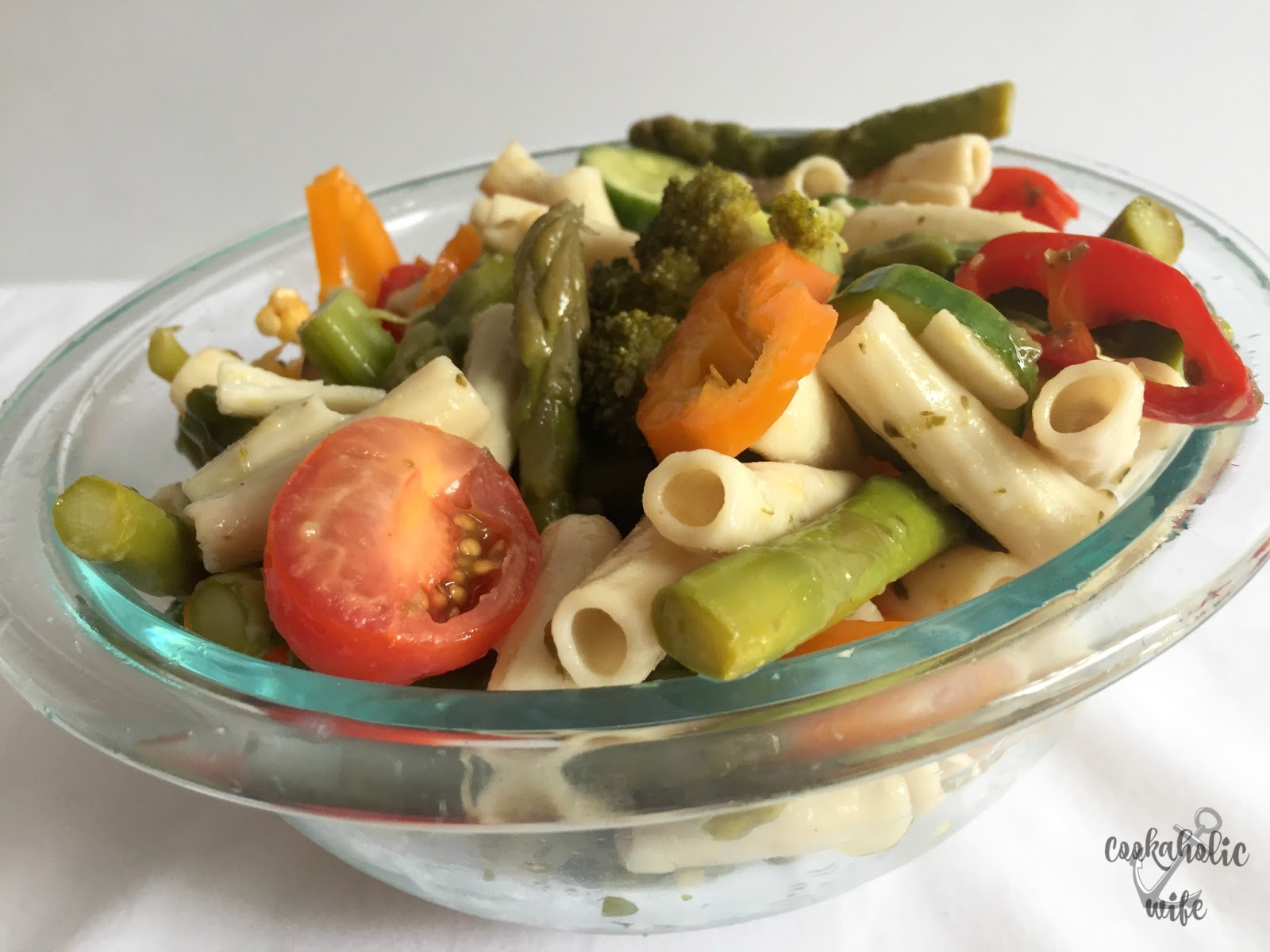 - 4. In a large bowl, add the cooked pasta, asparagus, broccoli and other raw veggies. Toss to combine.