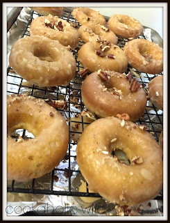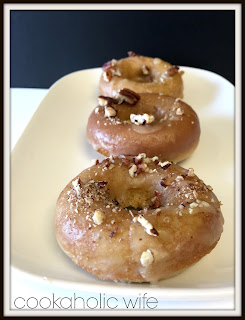 8. Line a large baking sheet with foil or parchment paper and place the wire rack of cooled doughnuts on top. Drizzle the glaze over the doughnuts and immediately sprinkle with the chopped, toasted pecans. Serve immediately.